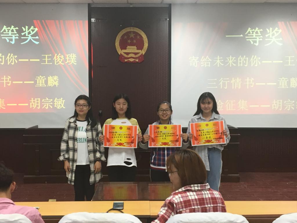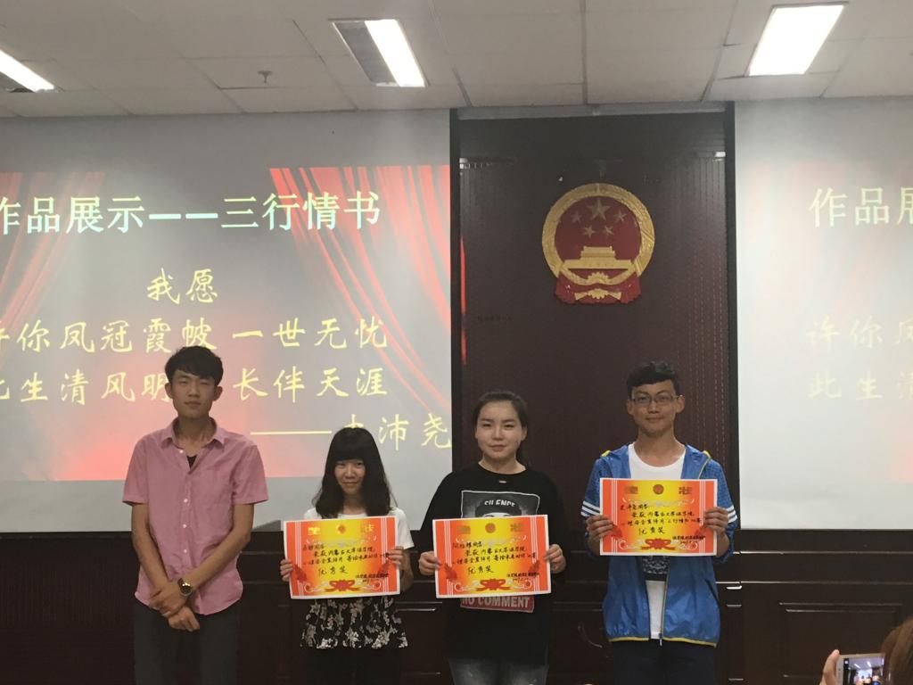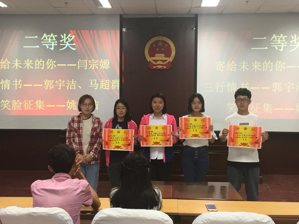 此次评选活动也本着公平公正的原则严格进行。在征集完全部参赛作品后,由内蒙古大学法学院学生会副主席邬莎、乔仁舆,以及心育部部长王亚伟、薛天龙在模拟法庭经过对每个作品严格按照评分标准打分,并经过认真的商讨,最终评选出了三个活动的一等奖、二等奖、三等奖和优秀奖。获得 “寄给未来的你”比赛一等奖的是王俊璞同学,获得 “三行情书”比赛一等奖的是童麟同学,获得 “笑脸征集”比赛一等奖的是胡宗敏同学。